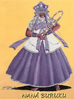 Naná Burukú es la Orisha de la llovizna, del lodo, mediadora entre la vida y la muerte. Su culto es de procedencia Fon, Ashanti y Arará (Dahomey), sobre todo de territorio Mahi. Su nombre proviene del Yorùbá Nanà Burukú (Naná: gran madre o abuela - Burukú: maldad). Naná es anterior a la llegada de Oduduwá a Ilé Ifé y tuvo posteriormente un enfrentamiento con Oggún, por eso sus animales no se inmolan con cuchillo de hierro, sino que se trozan con un cuchillo hecho de caña brava.